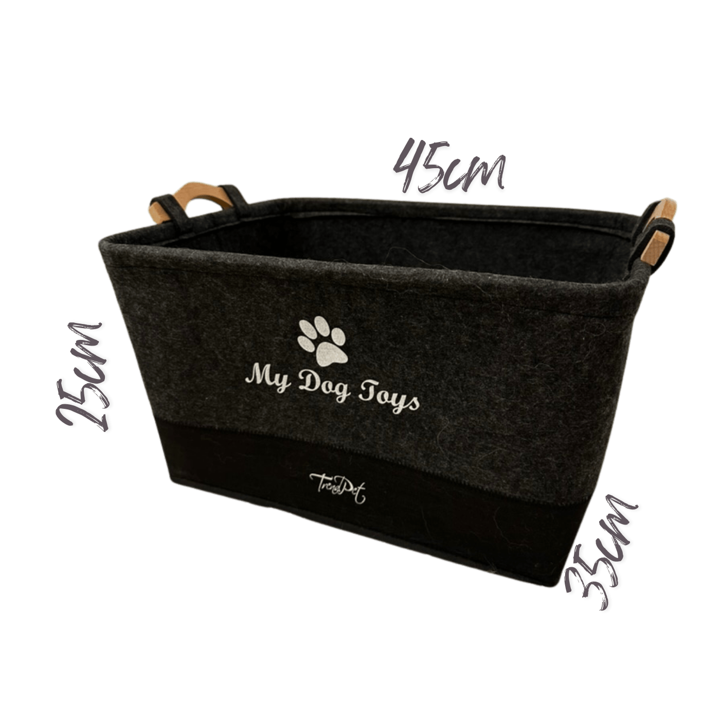 • Spielzeugkorb „My Dog Toys“ aus hochwertigem Filz mit Holzgriffen von „TrendPet“ (für mehr Ordnung im Pfoten-Chaos) (Maße: B 45cm x H 25cm x T35cm)