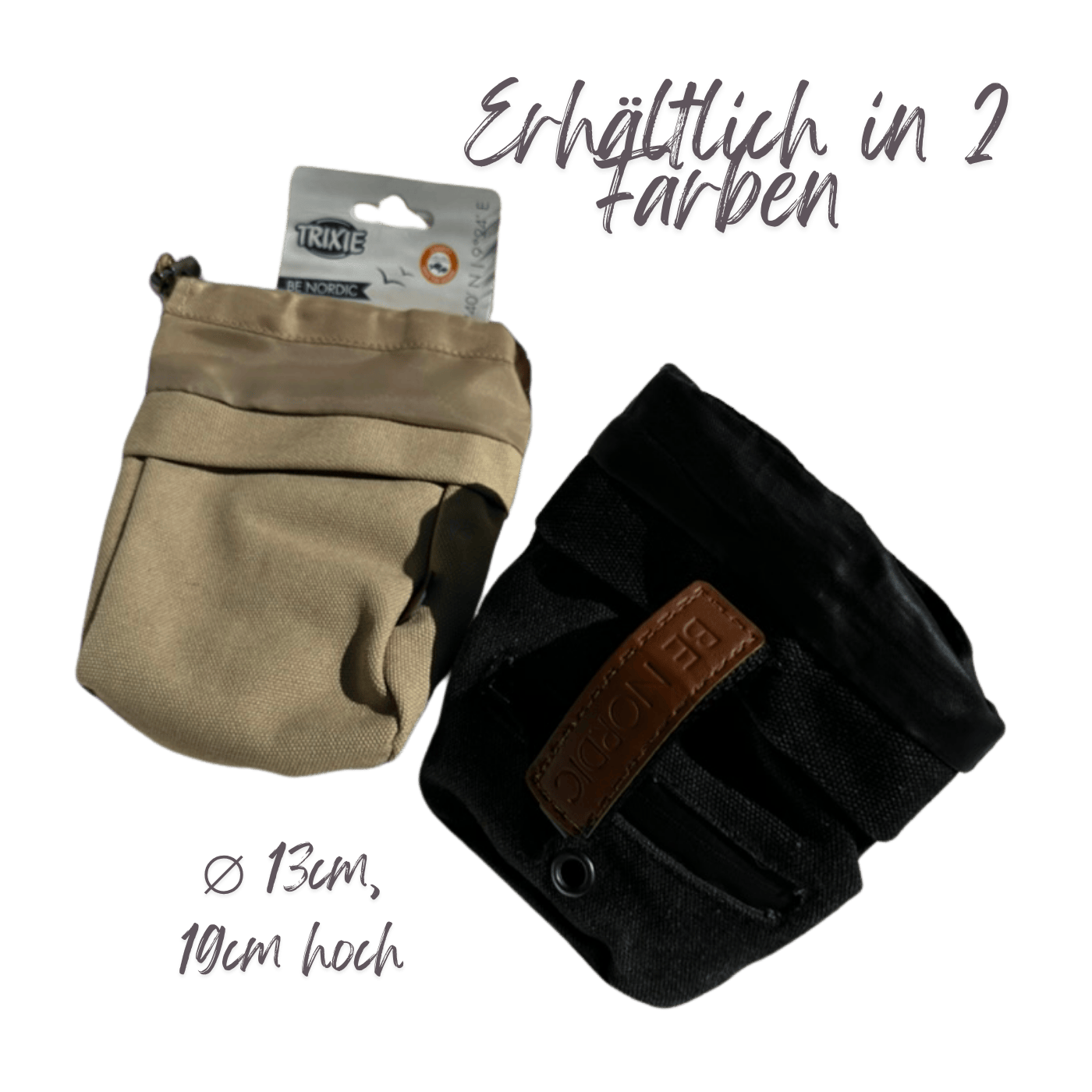 • Snackbeutel „Be Nordic“ von „Trixie“ aus Polyester (In den Farben „schwarz“ oder „sand“). Mit Kotbeutelspender, praktischem Befestigungsclip und Gürtelschlaufe. Innen feucht auswischbar oder per Handwäsche waschbar. Das Zugband hält den Beutel bei Bedarf fest geschlossen, damit ohne Erlaubnis keine Hundenase hineinpasst. (ca. 19cm hoch und ca. 13cm Durchmesser) (für beide Pakete gleiche Größe)