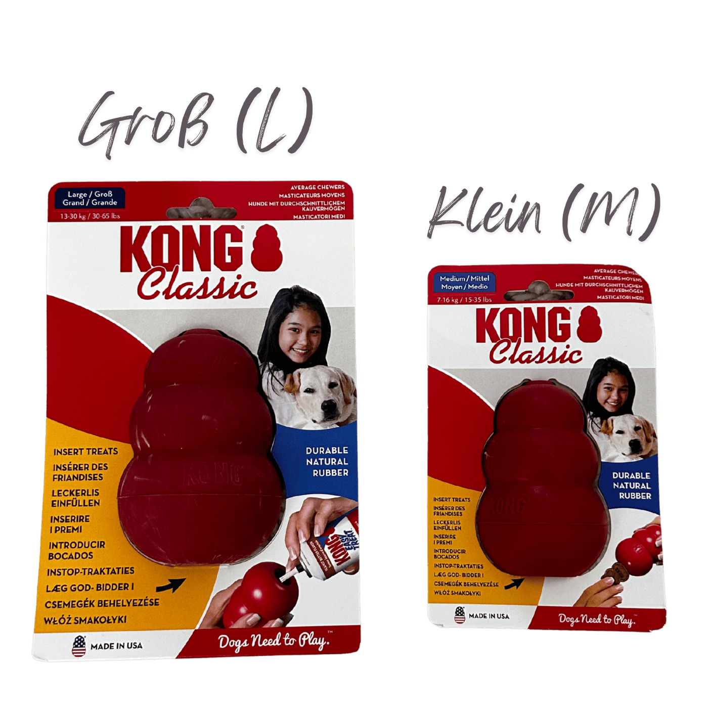 • Kau- und Schleckspielzeug „Kong Classic“ – kaustabil auch für starke Kauer, hüpft durch seine Form asymmetrisch über den Boden, gefüllt als Snack oder sogar als Hundeeis eine besondere Belohnung (Paket „klein“ Größe M, Paket „groß“ Größe L)