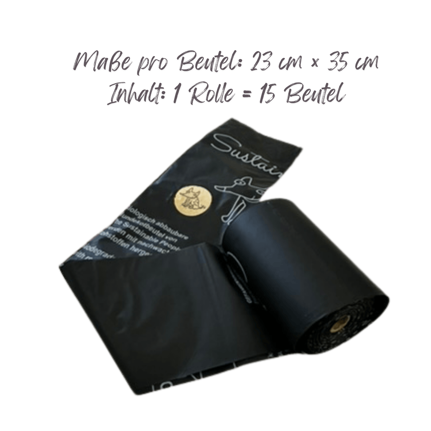 • 1 Rolle (15 Kotbeutel) biologisch abbaubare Kotbeutel „Sustainable People“. Extra reißfest und feuchtigkeitsbeständig. (Maße: 23cm x 35 cm)