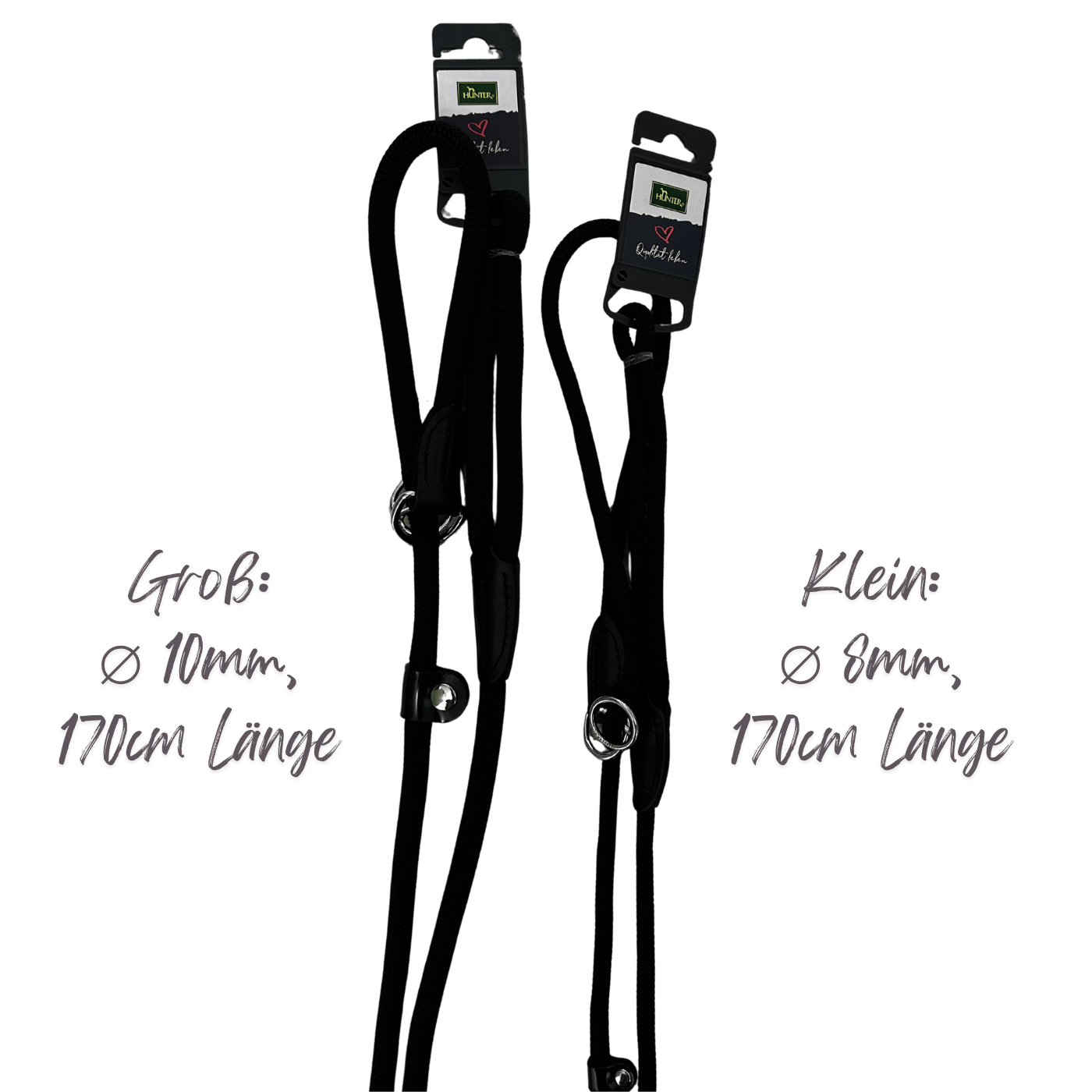 • Schwarze Retrieverleine mit Zugstopp von „Hunter“ entweder in Größe „klein“ (8mm Durchmesser, 170cm lang) oder in Größe „groß“ (10mm Durchmesser, 170cm lang)