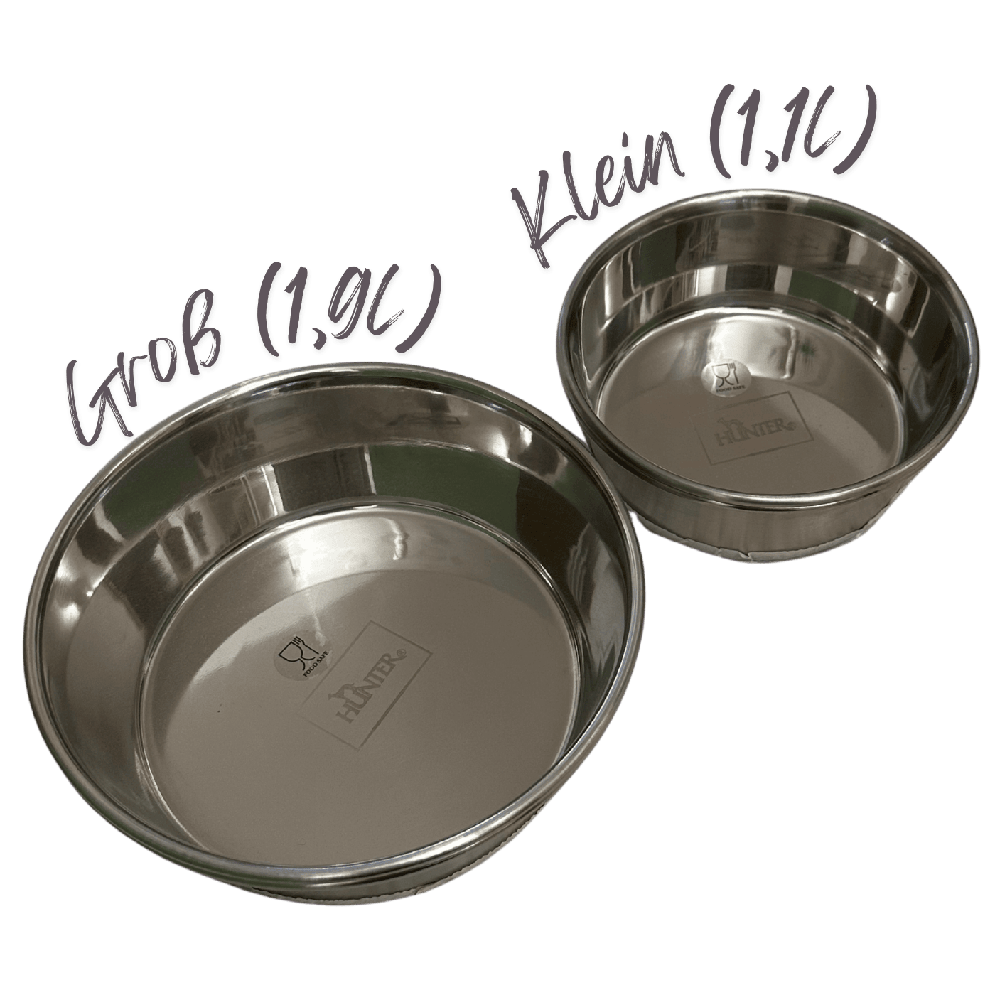 • 2 Edelstahl-Näpfe (Futter & Wasser) von „Hunter“ entweder in Größe L (im Paket „klein“, 1,1l Fassungsvermögen) oder Größe XL (im Paket „groß“, 1,9l Fassungsvermögen)