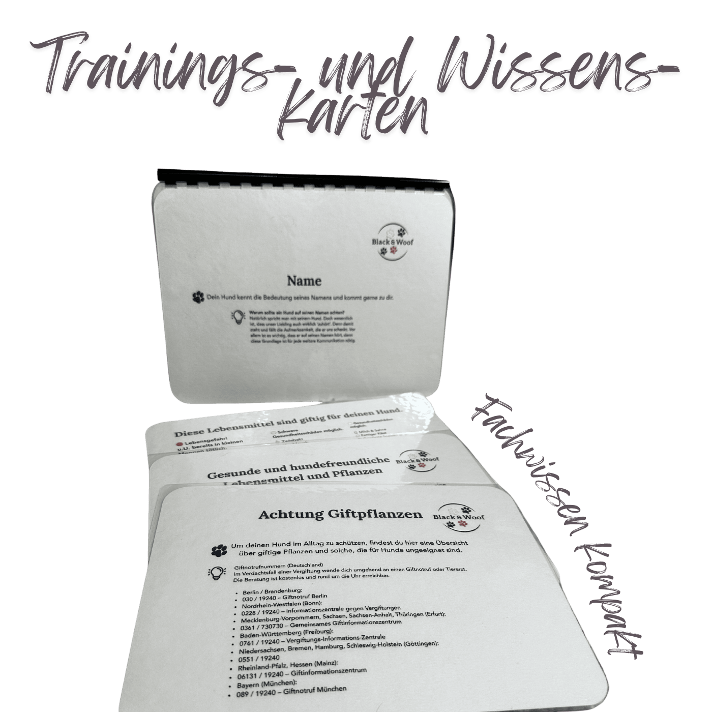 Die vereinte Expertise aus Hundetrainer & Hundeernährungsberaterin kurz und alltagstauglich in 9 Trainings- bzw. Wissenskarten für dich zusammengefasst auf stabilem, nachhaltigem Karton: