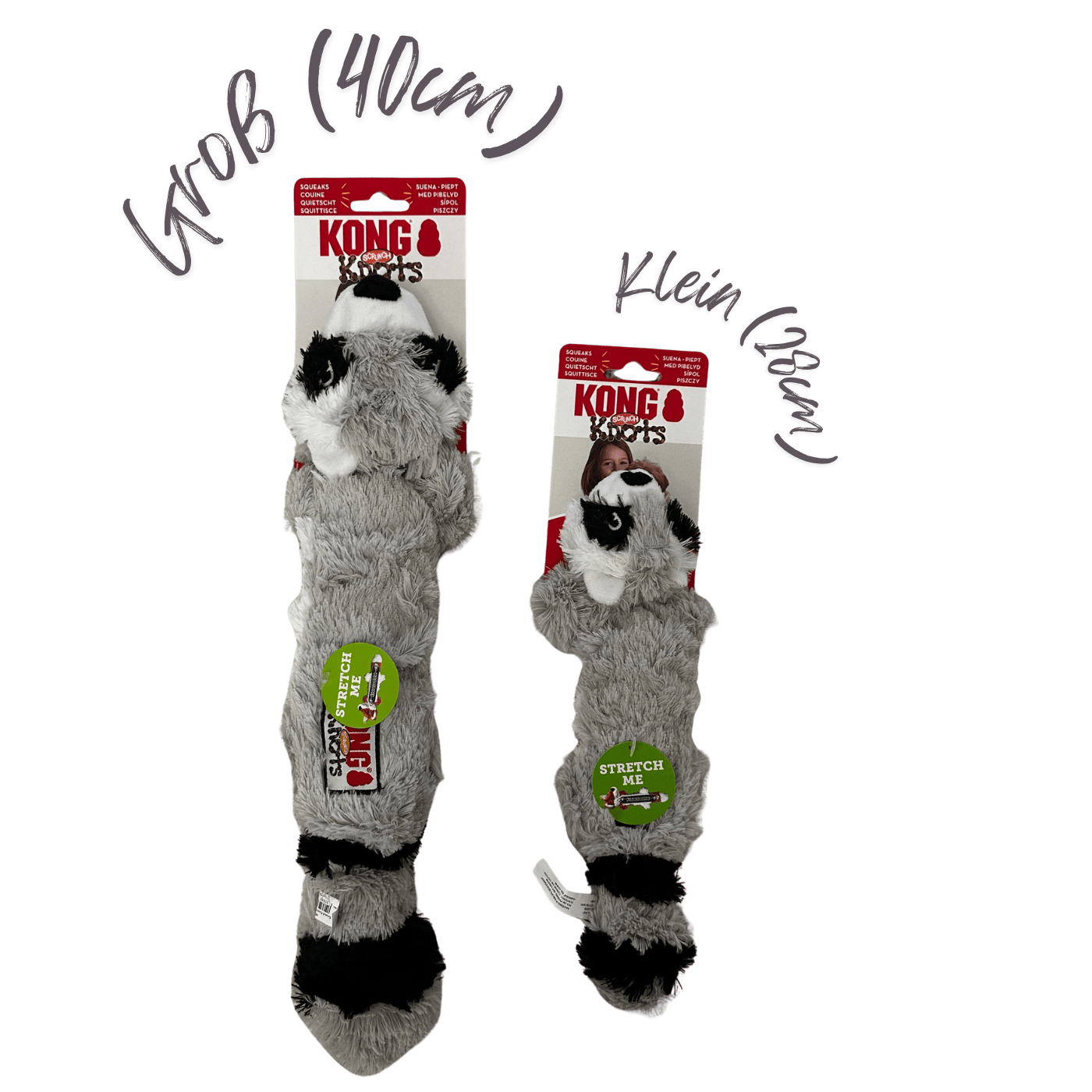 • Hundespielzeug „Kong Knots Waschbär“ – Ein Knotenstrick verpackt in einem samtweichen, sehr robusten Waschbären – zum Schmusen und Kauen. (Paket „klein“ ca. 28cm lang, Paket „groß“ ca. 40cm lang)